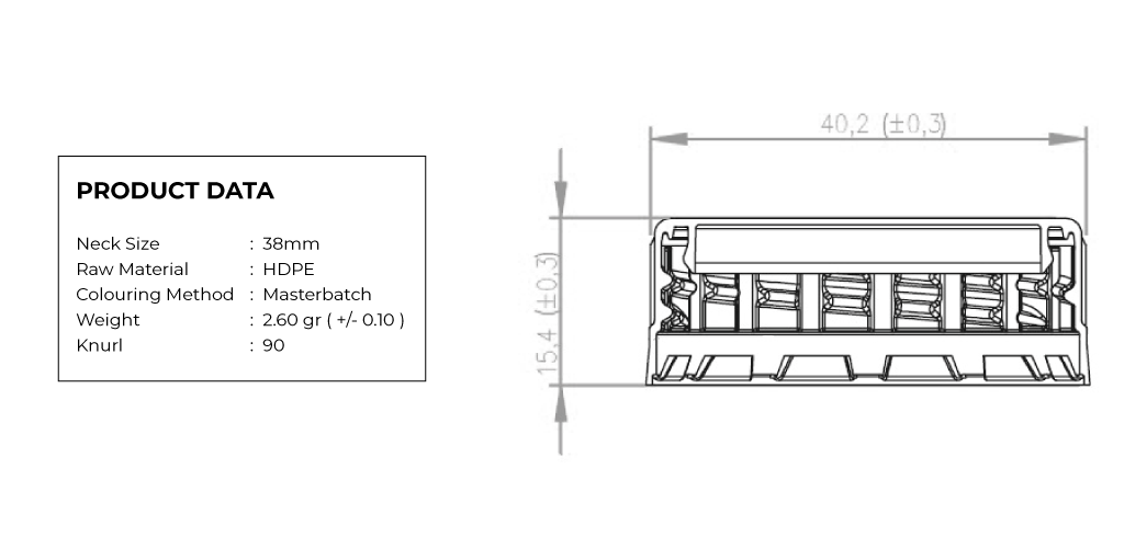 38 SFC kapak, kompresyon teknolojisiyle üretilen, yüksek dayanıklılığa sahip ve HDPE organoleptik yapısıyla su ile gazsız içecekler için ideal bir kapak çözümüdür.
